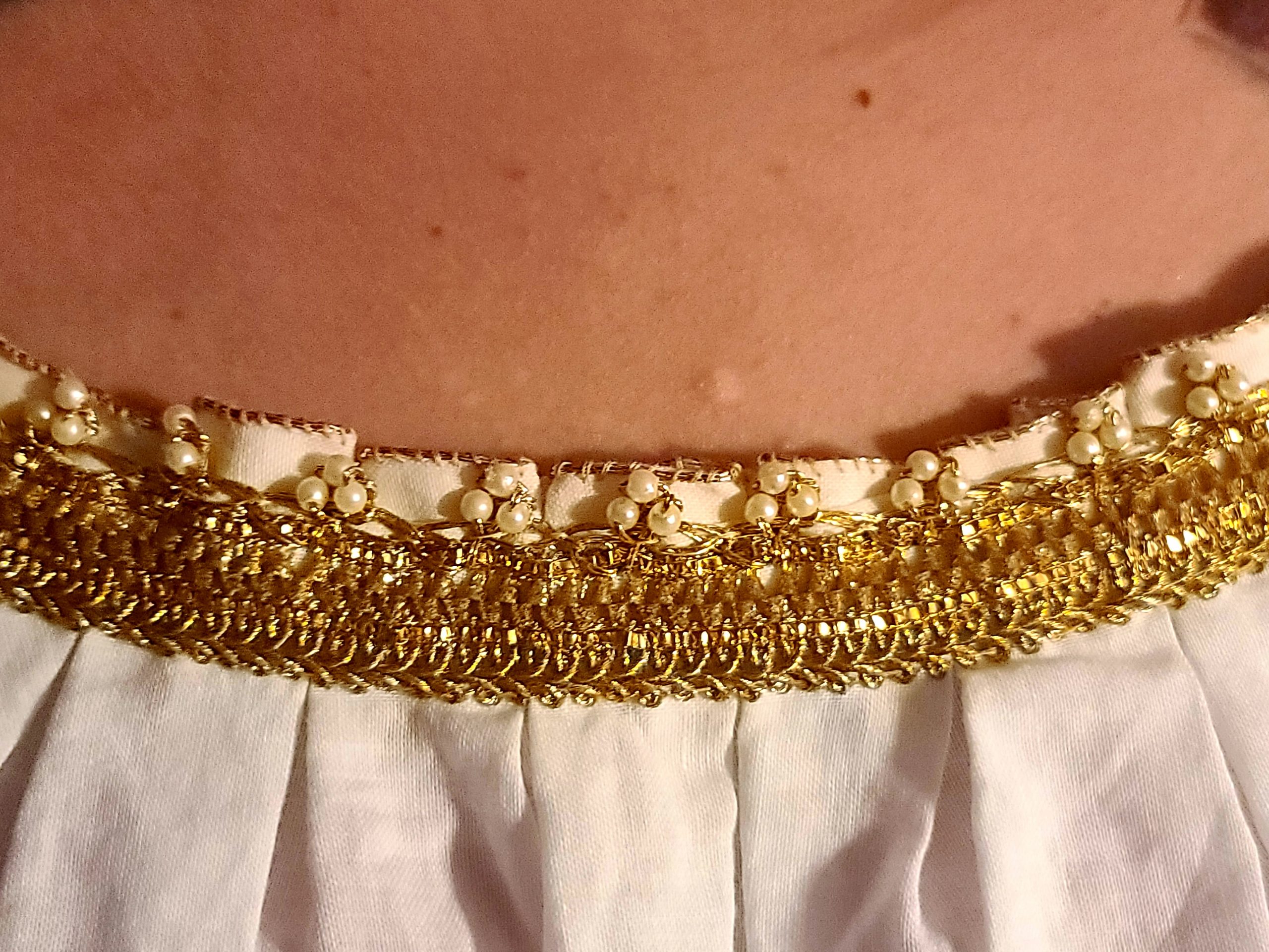 This camica was made from 3.78 oz linen sold by Tied to History.  The gold and faux pearl trim was an Etsy find from the shop theartfulbutton.  The gold cord couched to the very edge of the neckline was also an Etsy find from the shop lallehandmade.