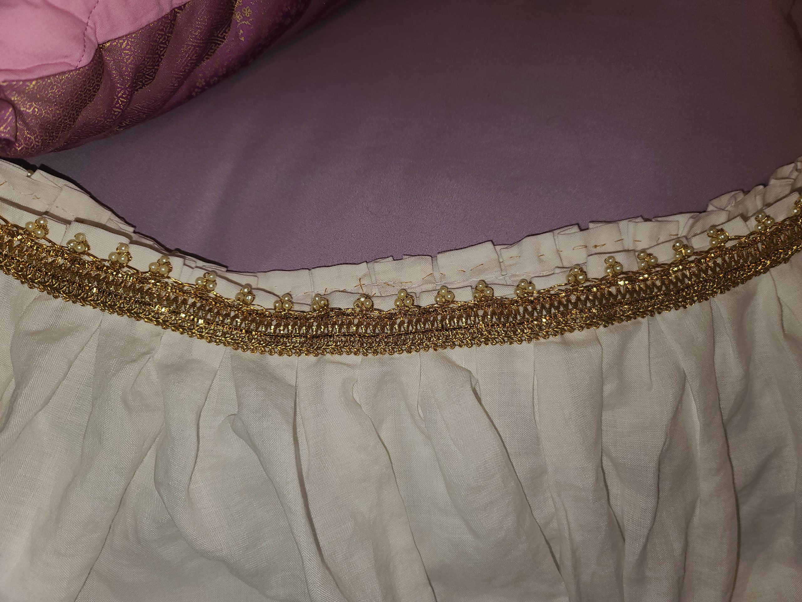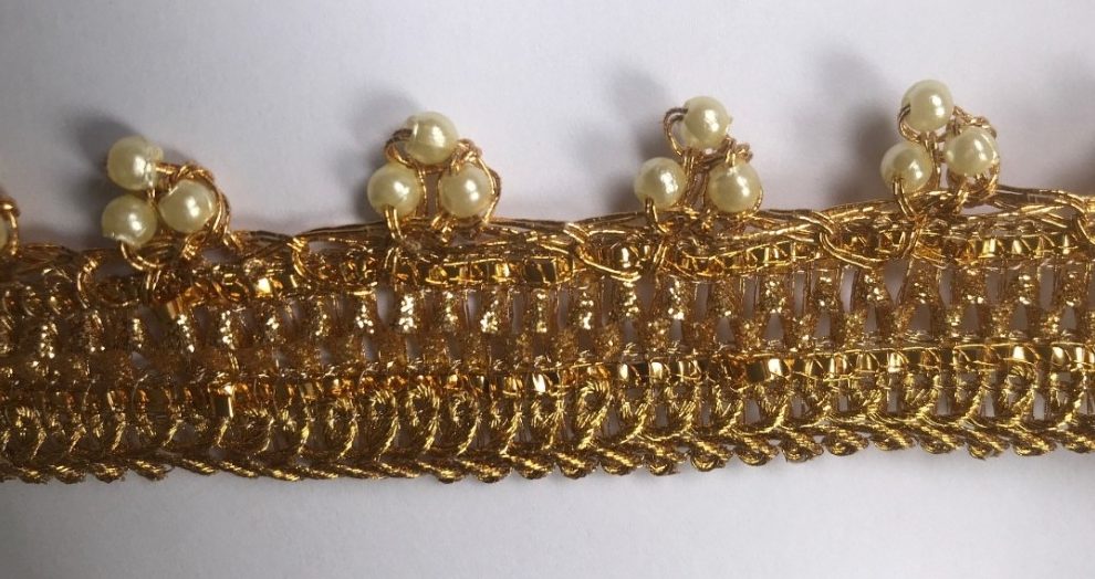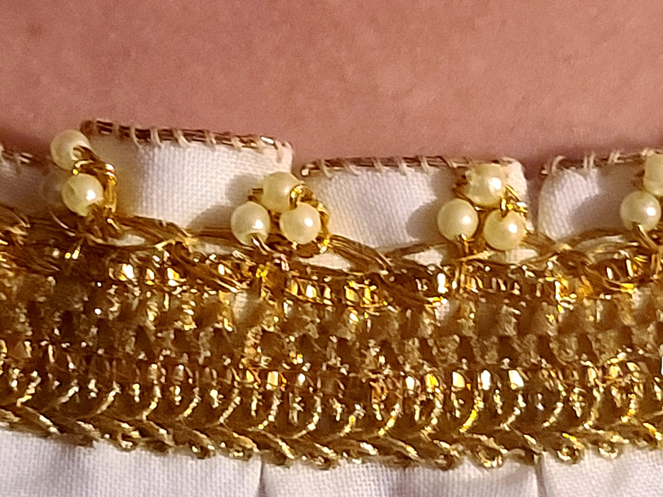 Step eight was stitching down my gold and faux pearl trim over the linen band.