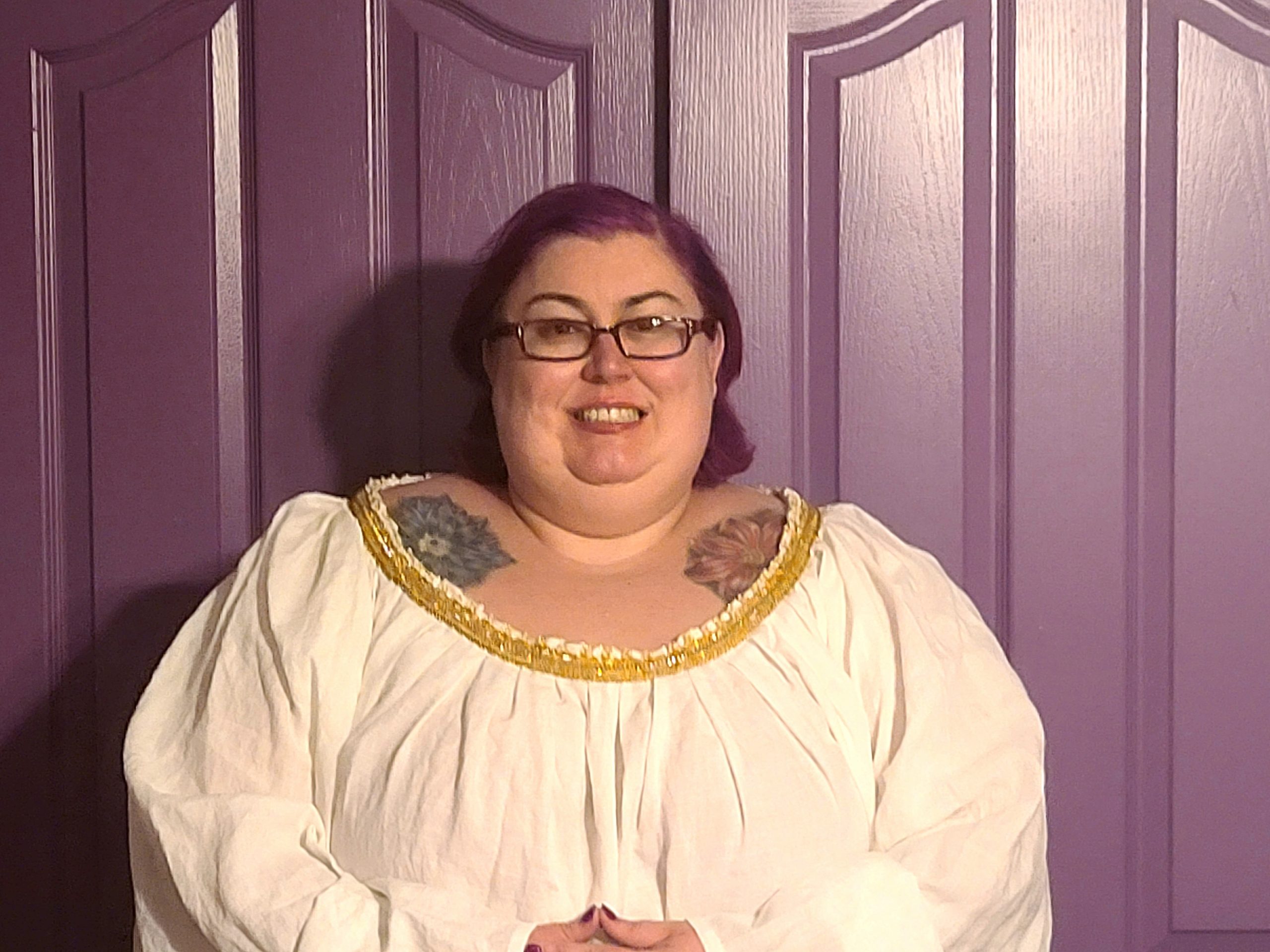 This was the first attempt at multiple things for Zanetta.  First, it was the first attempt at a rectangular constructed camica pattern based solely on my measurements.  Second, it was her first completely hand sewn garment using multiple techniques she had never tried before when hand sewing, including flat felled seams and inserting gussets.  In addition, the couched gold cord along the neckline was also a first for her.